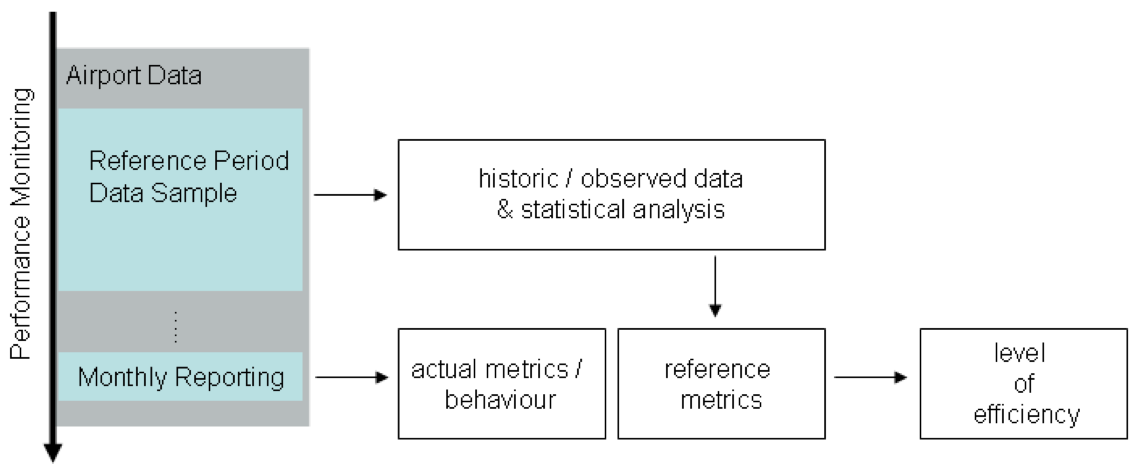 Performance in terms of additional ASMA time is monitored on the basis of regular reporting in comparison to a nominal reference. Based on regular reporting, metrics are derived for the respective reporting month. The current measurements are compared to a nominal reference to address the level of efficiency. The reference is derived from the statistical analysis of a reference period sample. This approach is depicted in Figure 2. Based on regular reporting, metrics are derived for the respective reporting month. The current measurements are compared to a nominal reference to address the level of efficiency. The reference is derived from the statistical analysis of a reference period sample.